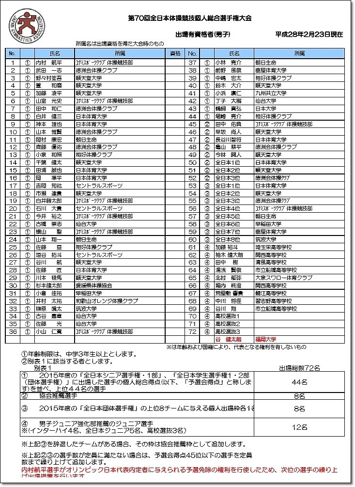 Apr 18, 2021 · 内村航平(ジョイカル)が、東京五輪出場に向けて好発進した。 体操の東京五輪日本代表選考を兼ねた第75回全日本体操個人総合選手権が18日に終了し、4度目の五輪出場を目指して鉄棒種目に出場した内村は、予選で15.166点、決勝で15.466点と高得点を獲得した。